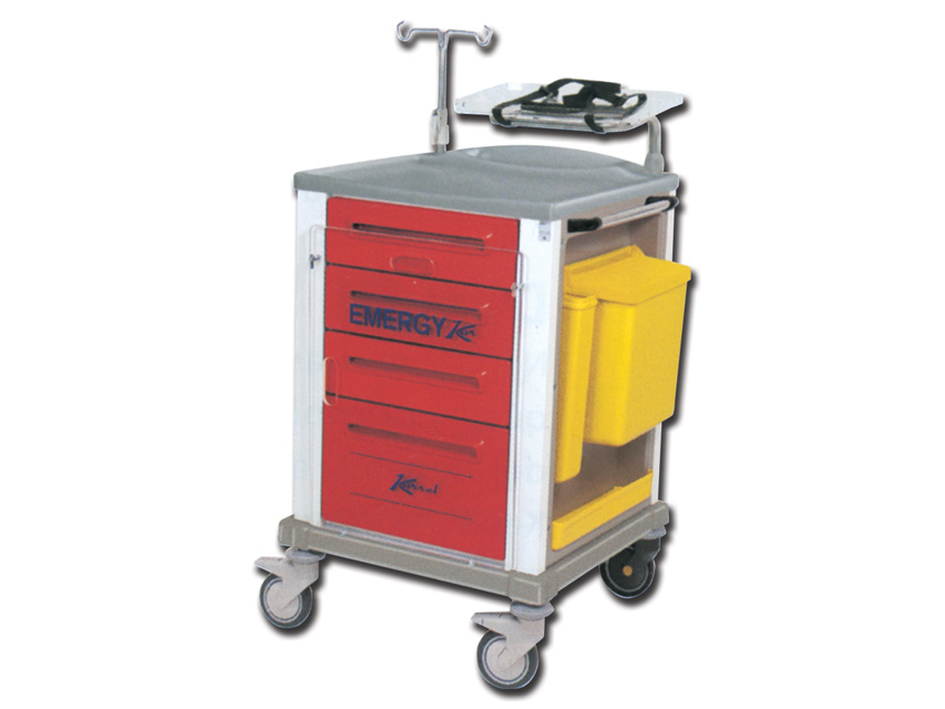 Carrello professionale con struttura in acciaio verniciato e finiture esterne in plastica. Fornito con 4 cassetti, un cestino laterale, un vassoio laterale aggiuntivo, asta porta flebo regolabile in altezza, supporto defibrillatore (vassoio in plexiglass), porta bombole ossigeno fino a 5 litri (sul retro), 4 rotelle in gomma antistatica.